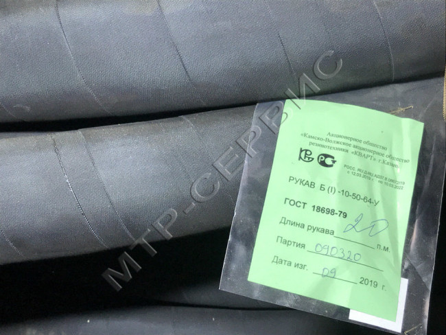 Рукав ГОСТ 18698-79 Б(I)-1,0-50х64 К. состоит из одного или нескольких слоев текстильного каркаса и резинового слоя. Изготавливаются согласно ГОСТ 18698-79.